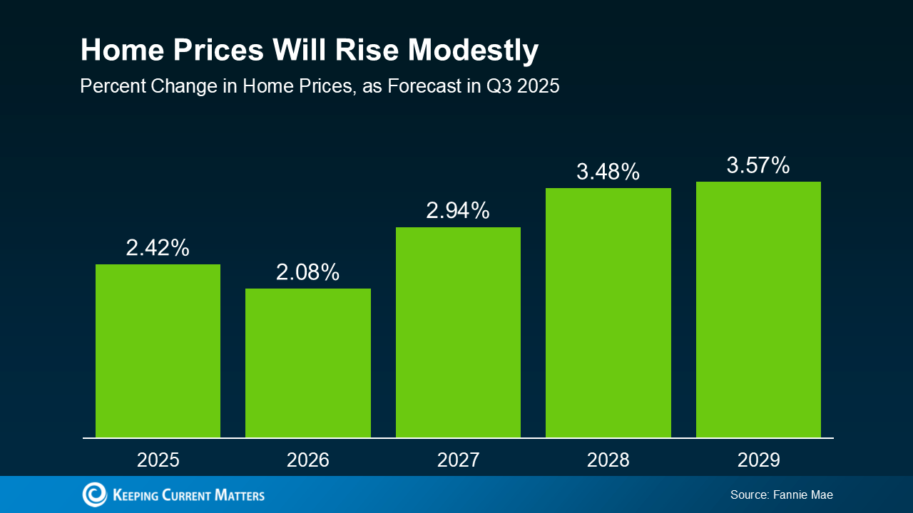 Of course, every local market is a little different. Some areas are still seeing prices climb, while others that saw huge spikes a few years ago are leveling off or seeing small corrections. But overall, the national picture is clear: experts surveyed by Fannie Mae project home prices will keep rising, just at a slower, more normal pace (see graph below):