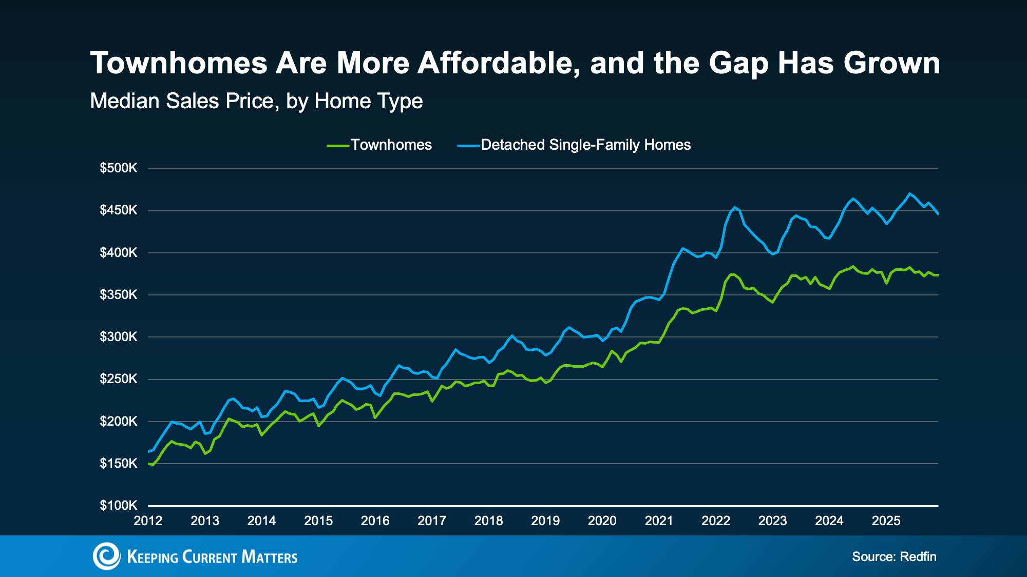 While prices vary by market, Redfin data shows townhomes are typically priced lower than detached single-family homes nationally. And that gap has grown in recent years as the supply of this type of home has grown too (see graph below):